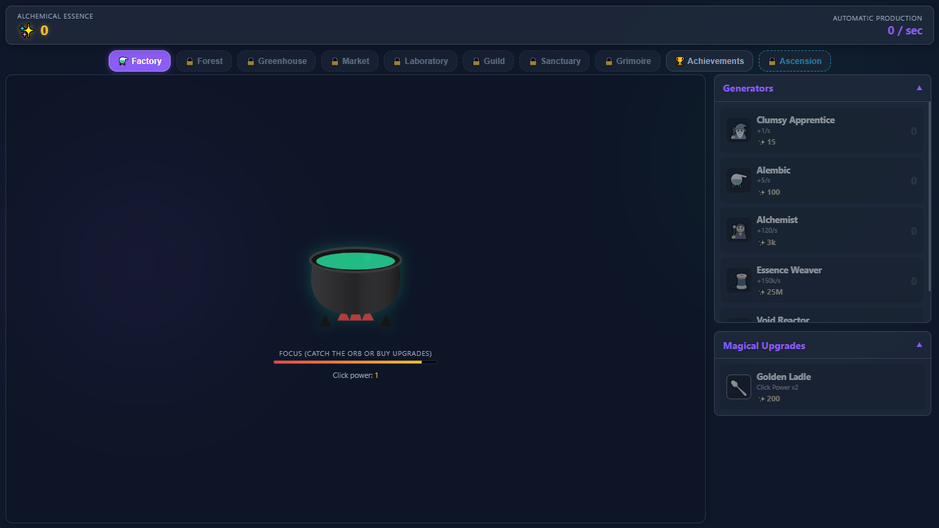 You start with a basic cauldron and a dream. You click, you get shiny magical essence, and you use it to buy stuff so the game clicks for you. Standard idle game stuff, but with a cool magical twist.